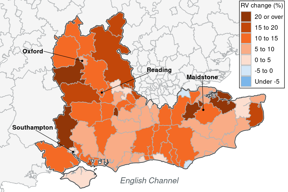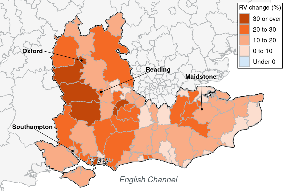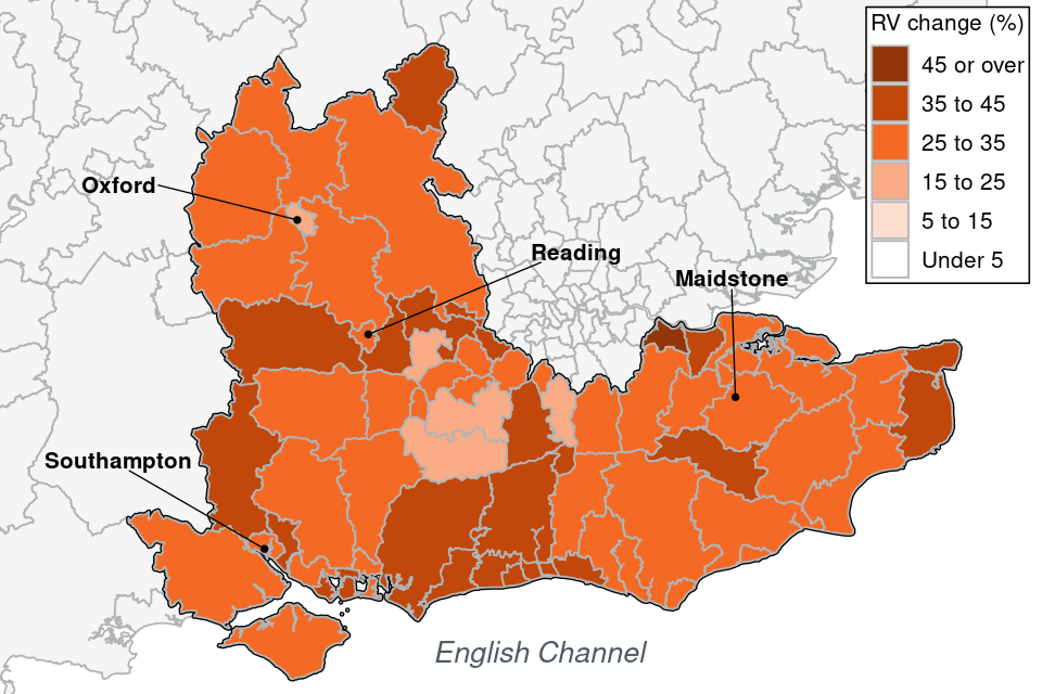 Figure 37: Percentage change in rateable value (RV) between 2017 and 2023 rating lists by administrative area, South East, all sectors