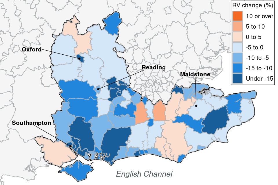 This section provides maps which show differences in the percentage change in rateable value from the 2017 local rating list to the 2023 list by administrative area across the South East region. This data, including the look-up for each administrative area, is also presented in Table A9 in the Appendix.