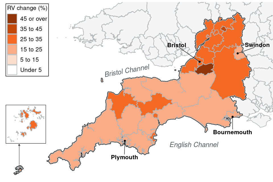 Figure 41: Percentage change in rateable value (RV) between 2017 and 2023 rating lists by administrative area, South West, all sectors
