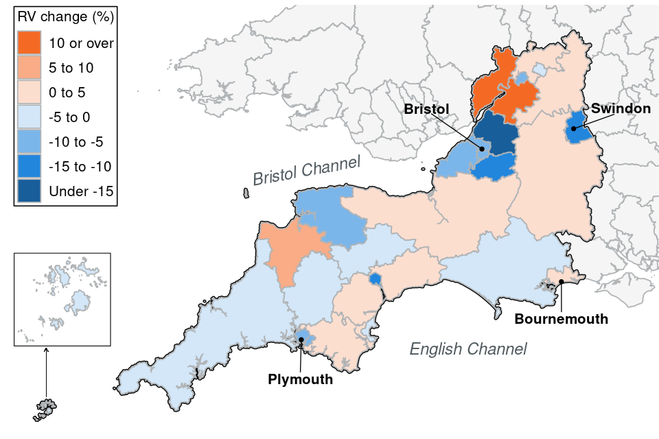 This section provides maps which show differences in the percentage change in rateable value from the 2017 local rating list to the 2023 list by administrative area across the South West region. This data, including the look-up for each administrative area, is also presented in Table A10 in the Appendix.
