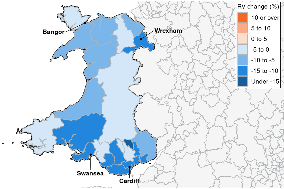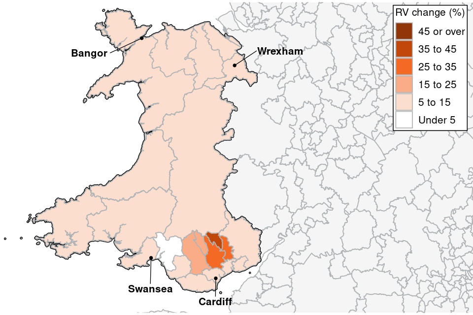 Figure 45: Percentage change in rateable value (RV) by administrative area, Wales, all sectors