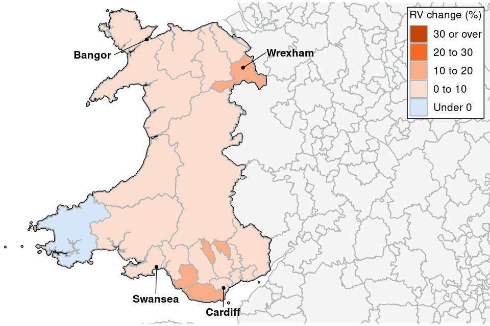 The maps showing administrative area differences do not include labels or a key with the names of each area due to the varying sizes of these areas on the maps. However, a labelled map alongside a table which provides a key and a full breakdown of percentage change in rateable value can be found for each area in the Appendix.