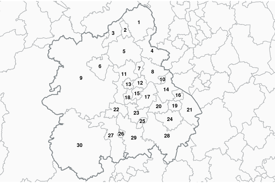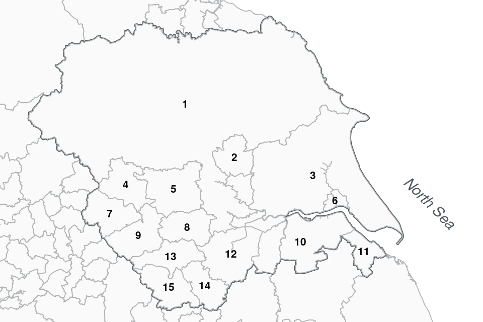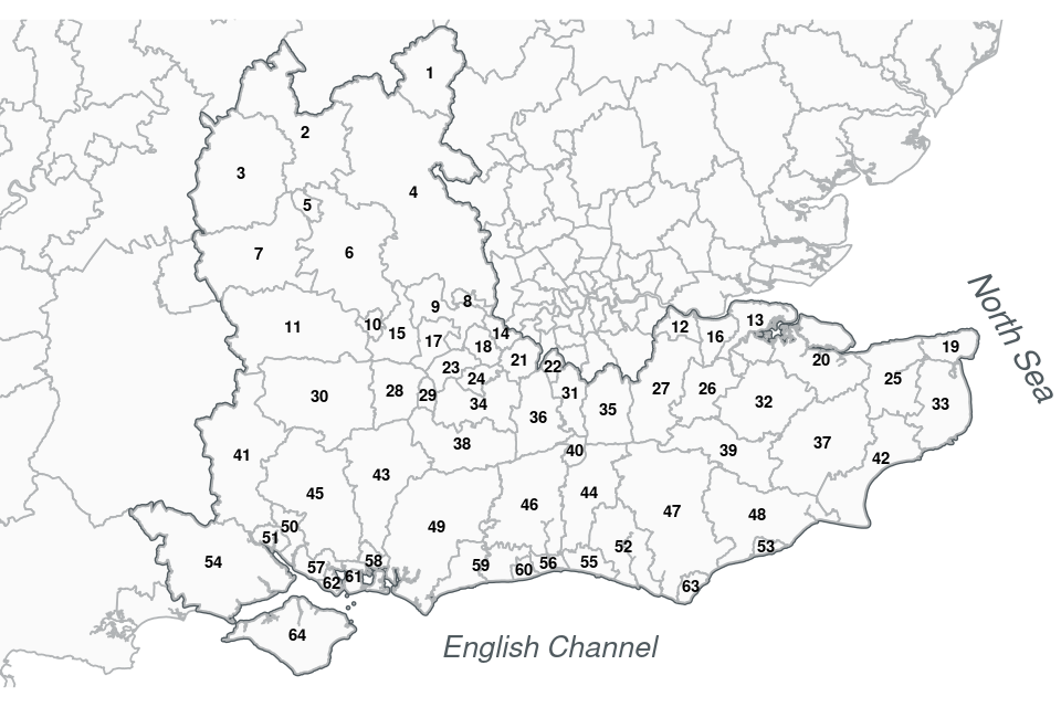 - Supporting maps which label each administrative area with a number that corresponds to a key which can be found in the table for each region