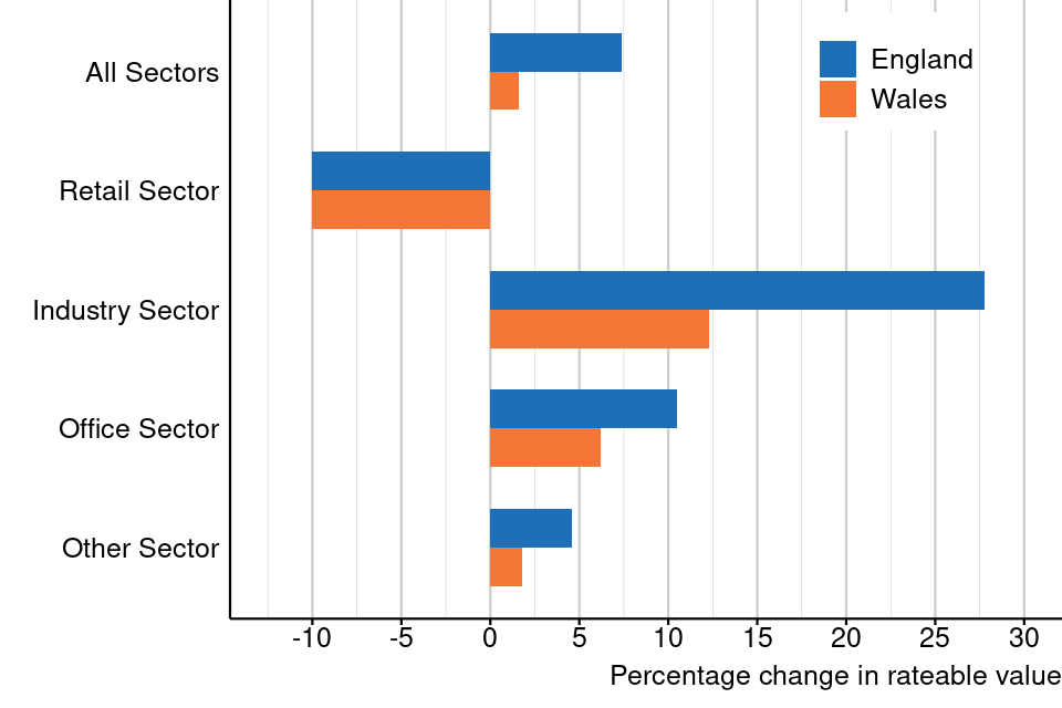 the retail sector was the only sector where rateable value decreased across England and Wales at revaluation, with a decrease of 10.0%