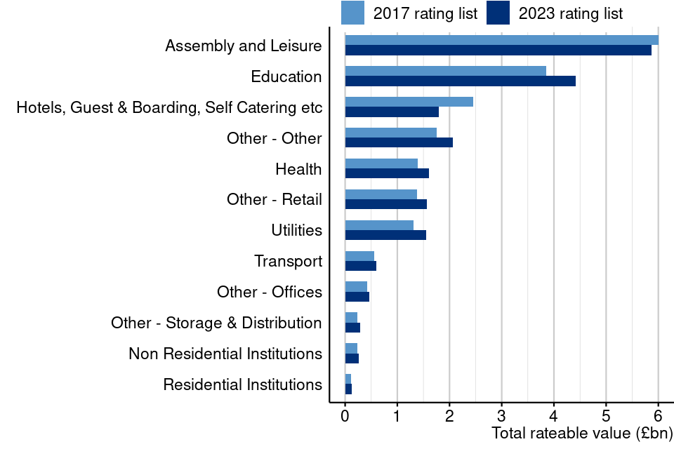 This section compares the total rateable value on the 2017 local rating list and the compiled 2023 local rating list for each sector in England and Wales.