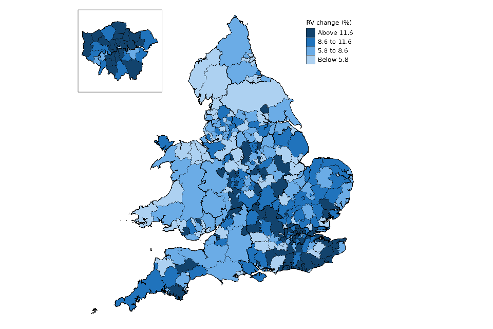 Source: NDR Revaluation 2026 compiled list (RVL_2_3) Figure notes: An expanded map of London Boroughs are shown in the top left of the figure