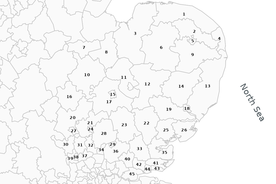 | E | East of England | 9.8 | 20.2 | 13.2 | 22.9 | 18.3 |