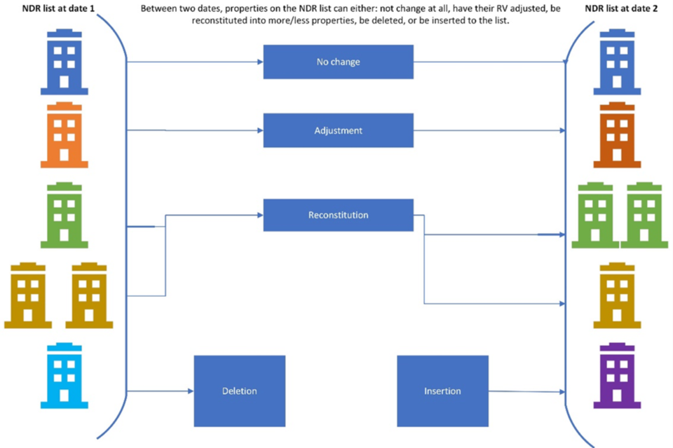 Reconstitutions: a re-configuration of hereditaments to (a.) split into more hereditaments, (b.) merge into fewer hereditaments, or (c.) rearrange into the same number)