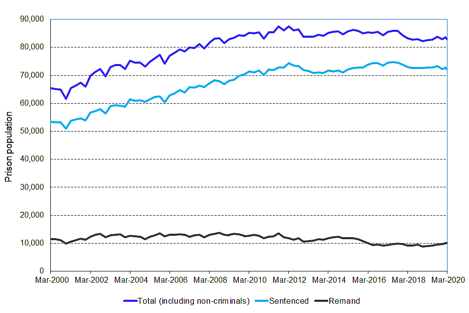 Figure 1: Prison population, March 2000 to 2020 (Source: Table 1.1)