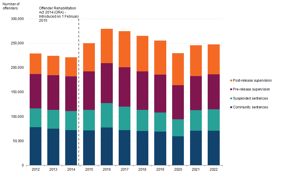 As a result of ORA being implemented in February 2015, the number of offenders starting pre-release supervision in custody increased by 114% from 45,063 in 2014 to 96,594 in 2016. Between 2019 and 2020, this figure decreased by 20% to 65,505 and then, unlike court order starts, which saw an increase in 2021, decreased by 8% to 60,226 in 2021, and by a further 12% in 2022 to 52,917.