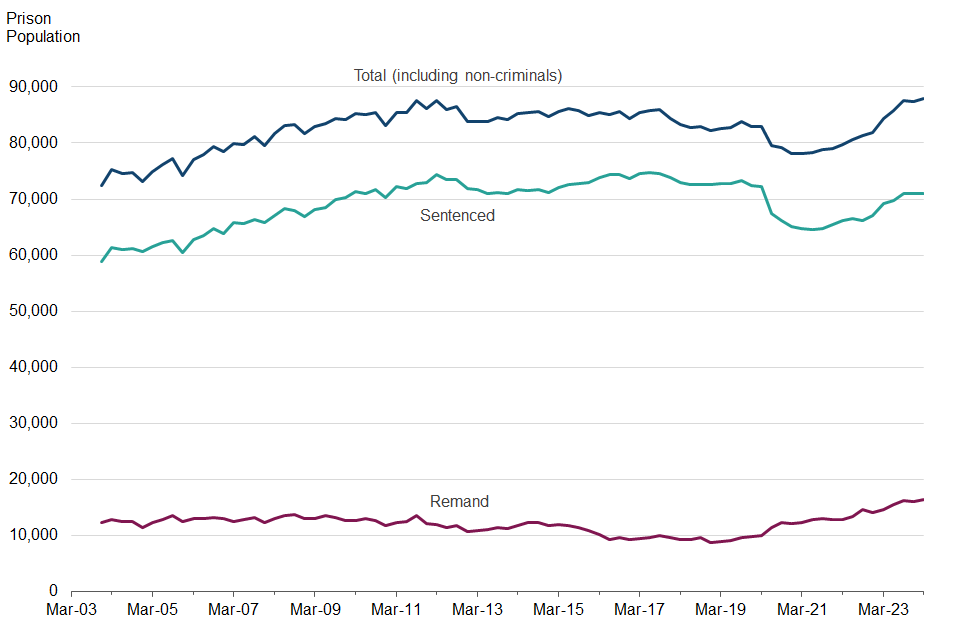 The remand prison population as at 31 March 2024 was 16,458. This represents the highest level for at least 50 years (effectively a ‘record high’).