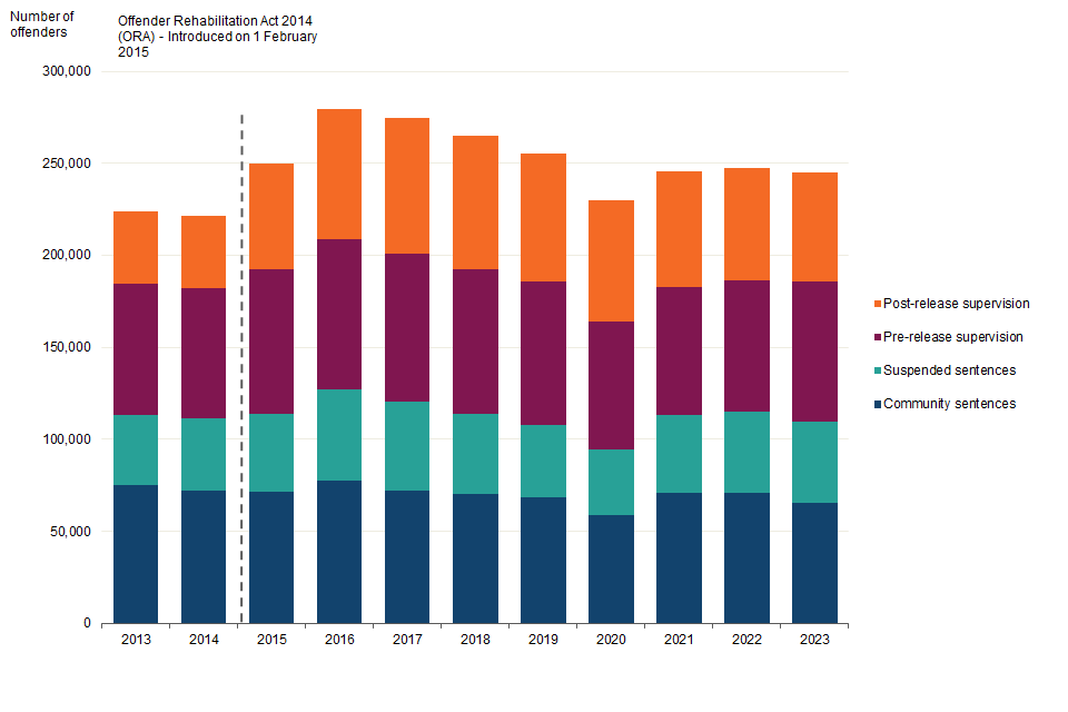 As a result of ORA being implemented in February 2015, the number of offenders starting pre-release supervision in custody increased by 114% from 45,063 in 2014 to 96,594 in 2016. Between 2019 and 2020, this figure decreased by 20% to 65,505 and then, unlike court order starts, which saw an increase in 2021, decreased by 8% in 2021 and by 12% in 2022, before increasing by 8% in 2023, the first year-on-year increase in pre-release supervision since 2016.