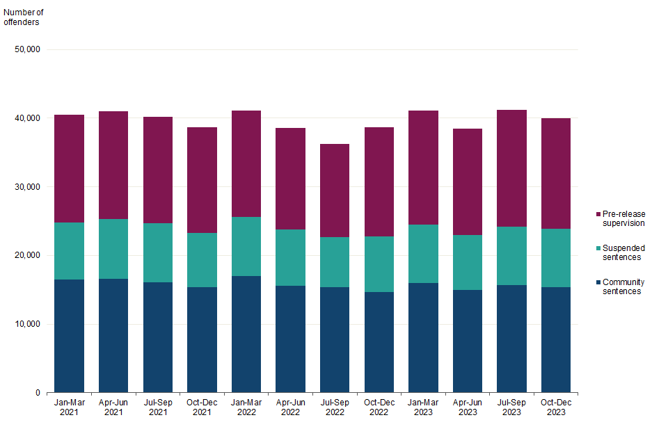 The number of offenders who started suspended sentence orders with requirements between October and December 2023 was fairly similar to that in the previous quarter (seeing a decrease of 0.2%). However, it has increased by 6% to 8,548 compared with the same quarter in the previous year. Those starting pre-release supervision decreased by 6% in comparison with the last quarter and increased by 1% compared with the same quarter last year to 16,090.