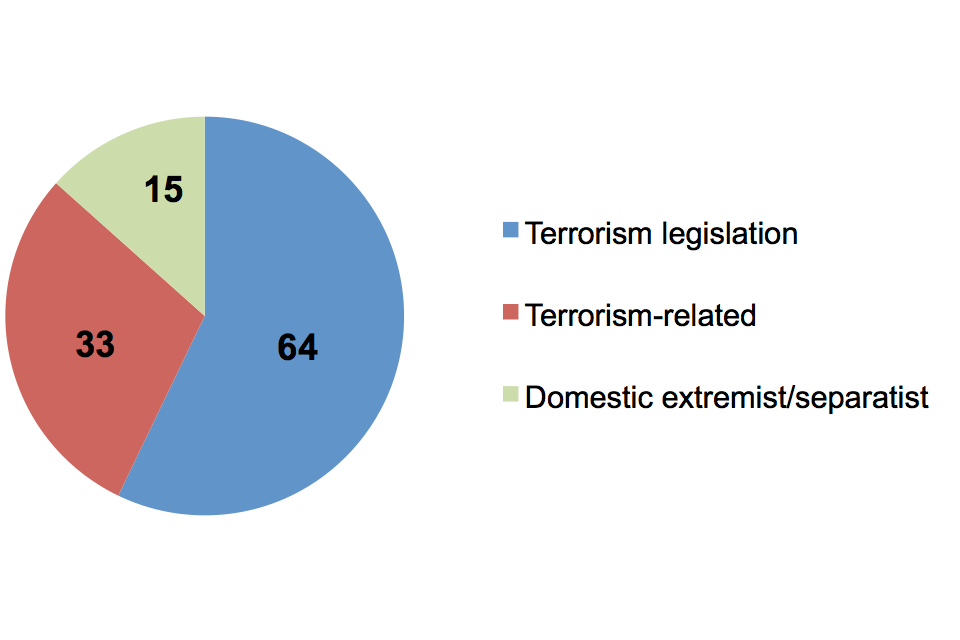 Since 11 September 2001, 516 persons have been charged with terrorism-related offences, of which 431 were prosecuted. Of these, 195 were convicted under terrorism legislation and a further 135 were convicted of non-TACT offences. In total, 64% of persons charged with terrorism-related offences have been convicted since 11 September 2001; however, this rate is likely to change depending on the outcome of cases for 15 persons awaiting prosecution at the time of publication.