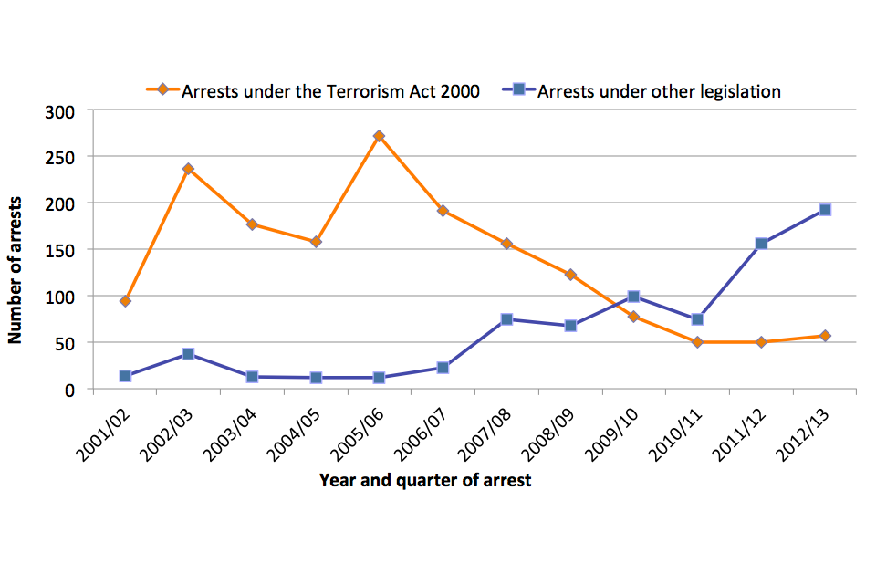 Line chart showing relationship between arrests under the Terrorism Act 2000 and arrest under the other legislation from 2001/02 and 2012/13.