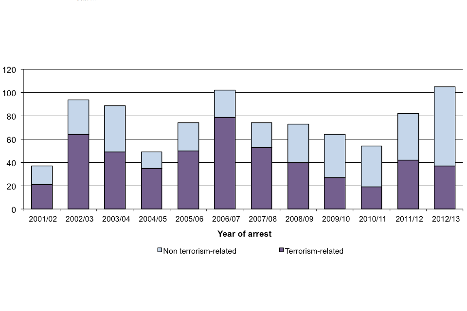 Due to the complex nature of terrorism investigations, trials may take place several years after an arrest or charge takes place. Trials completed in 2012/13 can relate to arrests made in 2011/12 or earlier.