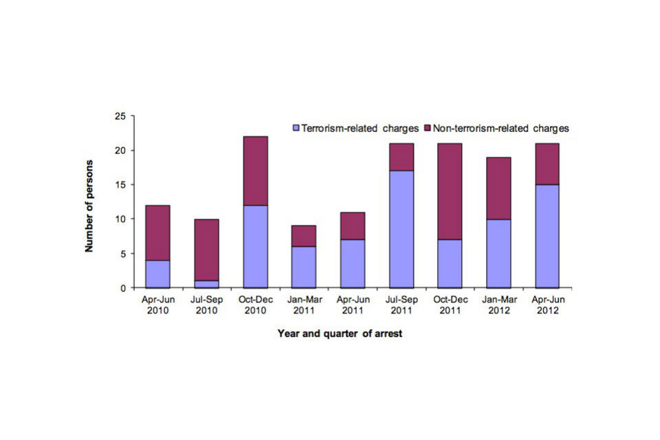 Of the 228 persons arrested in the year ending 30 June 2012, 82 (36%) were charged, a similar proportion to the 52 out of 140 (37%) in the previous 12 months. This compares to 808 persons charged out of 2,231 persons arrested since 11 September 2001, a charging rate of 36%.