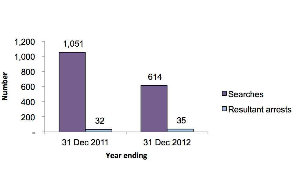 Of the 614 searches made in the year ending 31 December 2012, 35 (6%) resulted in arrest.