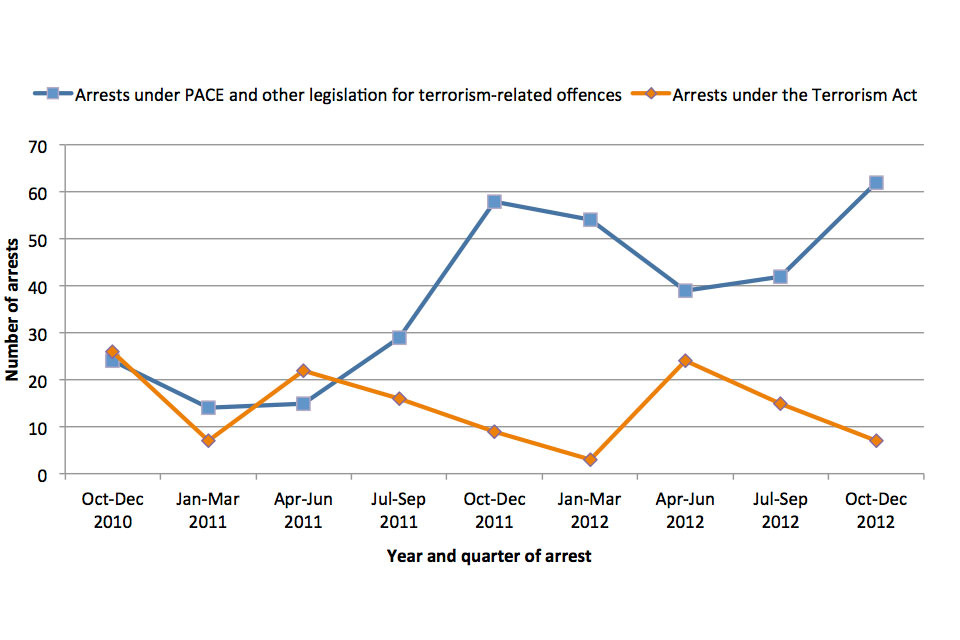 The relatively small numbers of terrorism arrests mean that proportionally large fluctuations in arrests can result from specific incidents or particular police operations.