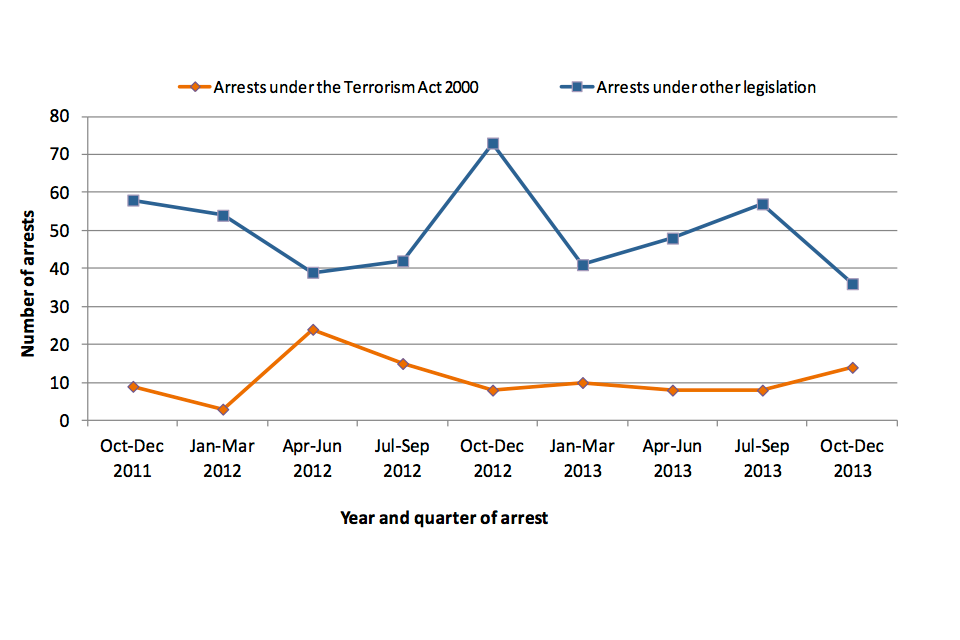Operation of police powers under the Terrorism Act 2000 and subsequent legislation: arrests, outcomes and stops and searches, quarterly update to 31 December 2013, Great Britain