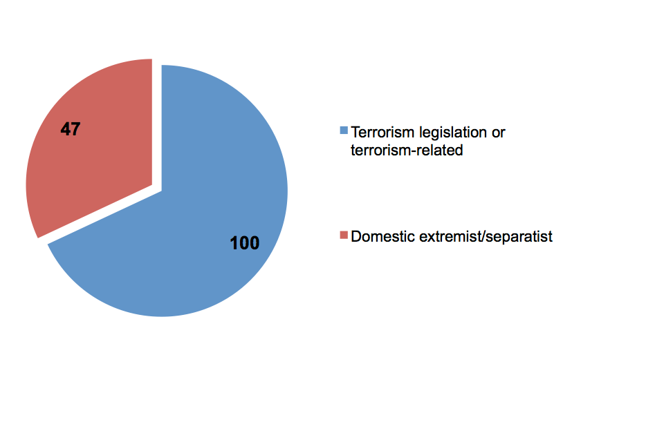 In terms of self-declared religions, 93 of the 100 terrorism legislation or terrorism-related prisoners defined themselves as Muslim. For the 47 domestic extremists/separatists the picture was more mixed, with 21 declaring no religion and 13 declaring themselves as Church of England.