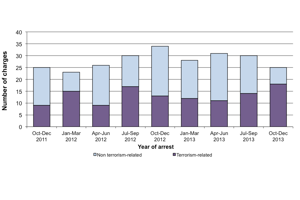 Of the 114 charges brought in the year ending 31 December 2013, 55 (48%) were terrorism-related, comprising 31 under terrorism legislation, a further 8 specifically under Schedule 7 to TACT for failure to comply with border controls and 16 under other legislation. The remaining 59 charges (52%) were for other non terrorism-related offences.