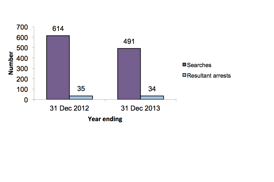 Information collected from the Metropolitan Police Service shows that, in the year ending 31 December 2013, 491 persons were stopped and searched under section 43 (s43) of TACT. This represents a 20% fall on the previous year’s total of 614. The arrest rate for s43 searches was 7% in the year ending 31 December 2013, up 1 percentage point on the previous year.