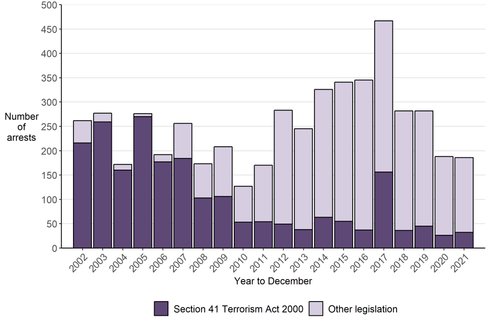 - in the year ending 31 December 2021, there were 186 arrests for terrorist-related activity in Great Britain, two fewer than the number in the previous 12-month period (a fall of 1%).