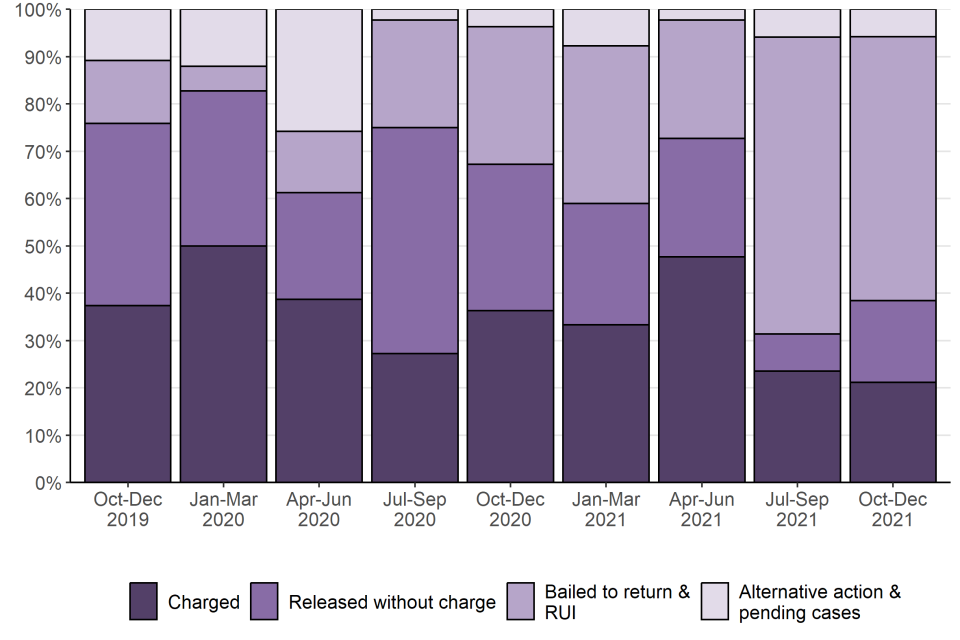 - ‘Bailed to return’ includes those released on bail pending further investigations, and those who have absconded from bail. Those who were released under investigation were previously unable to be recorded separately and were recorded as ‘released without charge’.