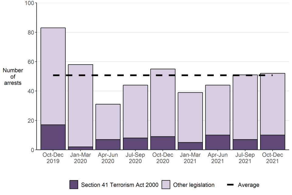 There were reductions in the number of arrests starting from April - June 2020. The reductions were most evident in arrests under non-terrorism legislation and may reflect the general reduction in traditional crime during this period when there were public health restrictions in place to control the spread of the COVID-19 virus. This effect was most marked in April to June 2020 during the national lockdowns in England and Wales with just 31 arrests in this quarter. Following the easing of restrictions over the summer months, the number of arrests increased (for example, up to 55 arrests between October to December 2020). During the third national lockdown the number of arrests fell again, between January to March 2021, down to 39. In the latest two quarters, between July and September 2021, and October and December 2021, the number of arrests increased, to 51 and 52, respectively.
