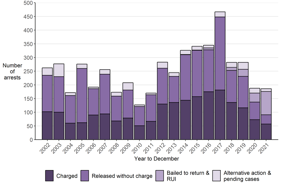 Figure 2.4: Charging outcomes following an arrest for terrorist-related activity, year ending December 2002 to December 2021, Great Britain1,2
