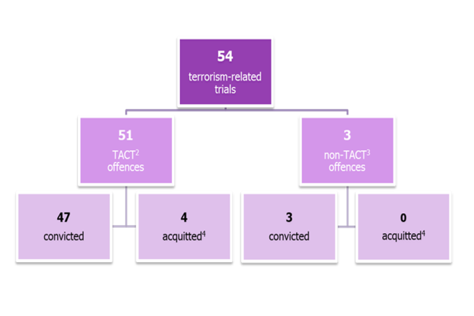 Further details of the specific legislation under which persons have been convicted following a charge for a terrorism-related offence can be found in data tables A - A.08a-c.