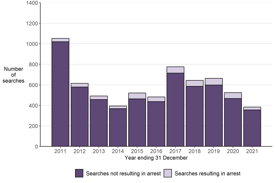 - in the year ending 31 December 2021, 383 persons were stopped and searched by the Metropolitan Police Service under s.43 of TACT 2000; this was a decrease of 27% compared with the previous year’s total of 524