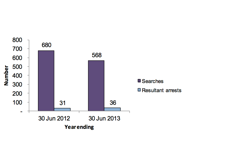 Information collected from the Metropolitan Police Service shows that in the year ending 30 June 2013, 568 persons were stopped and searched under s43 powers. This represents a 16% fall on the previous year’s total of 680. The arrest rate for s43 searches was 6.3% in the year ending 30 June 2013, up 2 percentage points on the previous year.