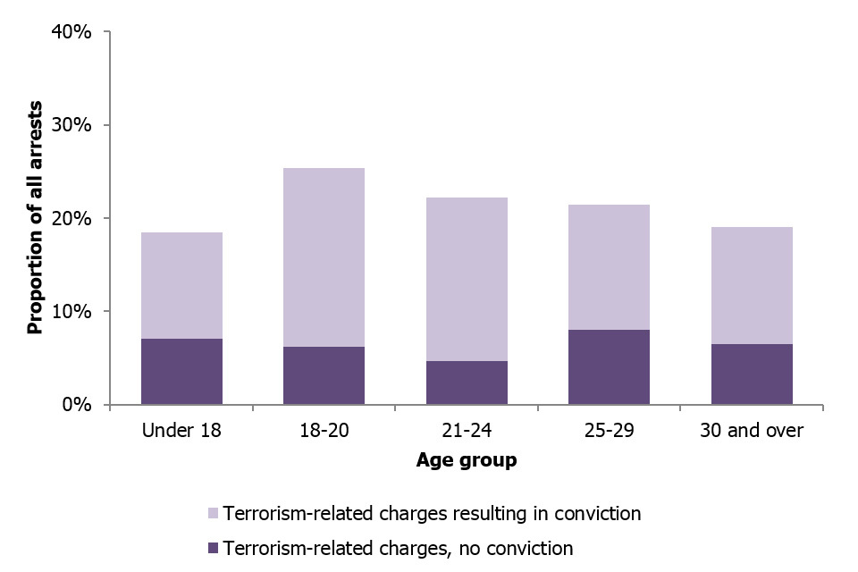 Conviction rates are generally higher for younger age groups. While around two-thirds of those charged with a terrorism-related offence since 11 September 2001 have been convicted, this rate was higher for the 18 to 20 age group and the 21 to 24 age group, which saw 76% and 79% of terrorism-related charges lead to a conviction, respectively.