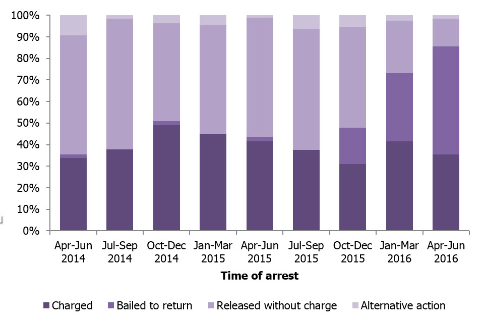 More recent quarters have a larger proportion of cases where individuals have been bailed to return. This is shown in Figure 3.2. As time progresses, these cases will eventually lead to a charge, release, or alternative action, and as a result charge rates will change over time. Until all cases in a given period are complete, caution should be taken when comparing charge rates over time.