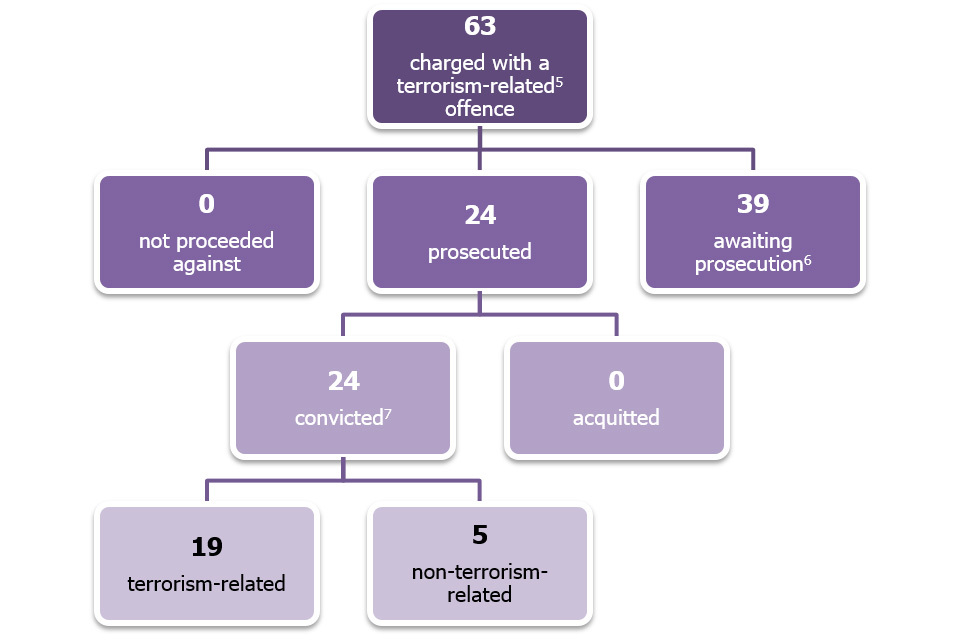 Of the 63 persons charged with a terrorism-related offence in the year ending June 2016, 24 have been prosecuted (as at the time of data provision to the Home Office: 27 July 2016), all of which were found guilty. A further 39 were awaiting prosecution.