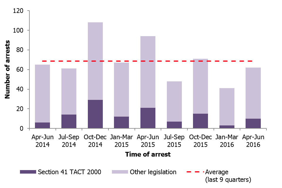 Arrests for terrorism-related offences fell by a third in the year ending June 2016 compared with the previous year (from 330 to 222 arrests). The number of arrests was less than in the year ending June 2015, but similar to other previous years.