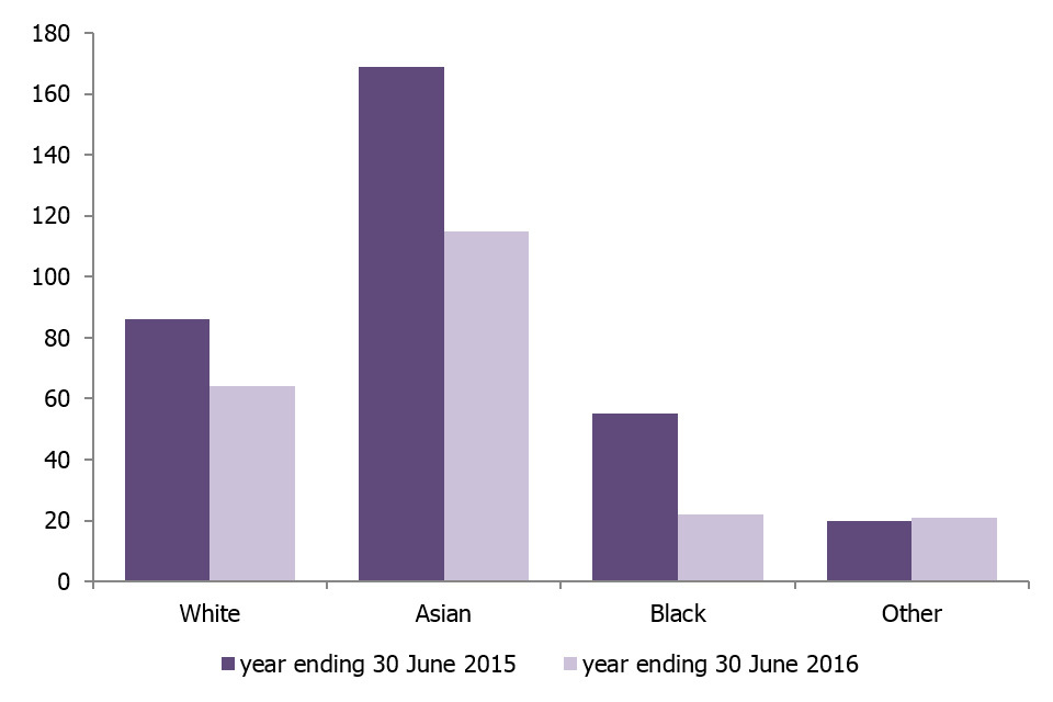 The number of arrests fell across all ethnic groups, except the ‘other’ group, which increased by 1 in the year ending June 2016, compared with the previous year. The biggest numerical fall was seen for those of Asian ethnic appearance, which fell by 54 arrests. However, those of Black ethnic appearance saw the largest percentage fall (60%).