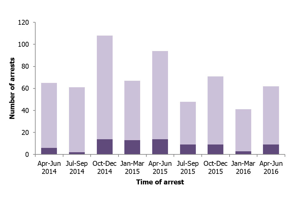 As cases progress over time, figures are likely to change. This is particularly relevant for more recent time periods where a larger number of cases will be incomplete (‘released on bail’ or ‘awaiting prosecution’). While the effect on the arrests total should be minimal, the number of charges and convictions will be lower for more recent quarters as a greater number of cases would not have reached the point of charge or conviction yet. Figures for these quarters will increase in future publications as more cases are completed.