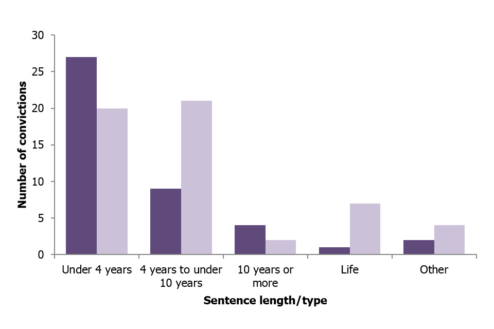There was an increase in the number of people receiving longer sentences in the most recent year, with those receiving sentences of between 4 and 10 years increasing from 9 to 21, and the number of life sentences given increasing from 1 to 7. The number of individuals receiving a sentence of less than 4 years fell by from 27 to 20.