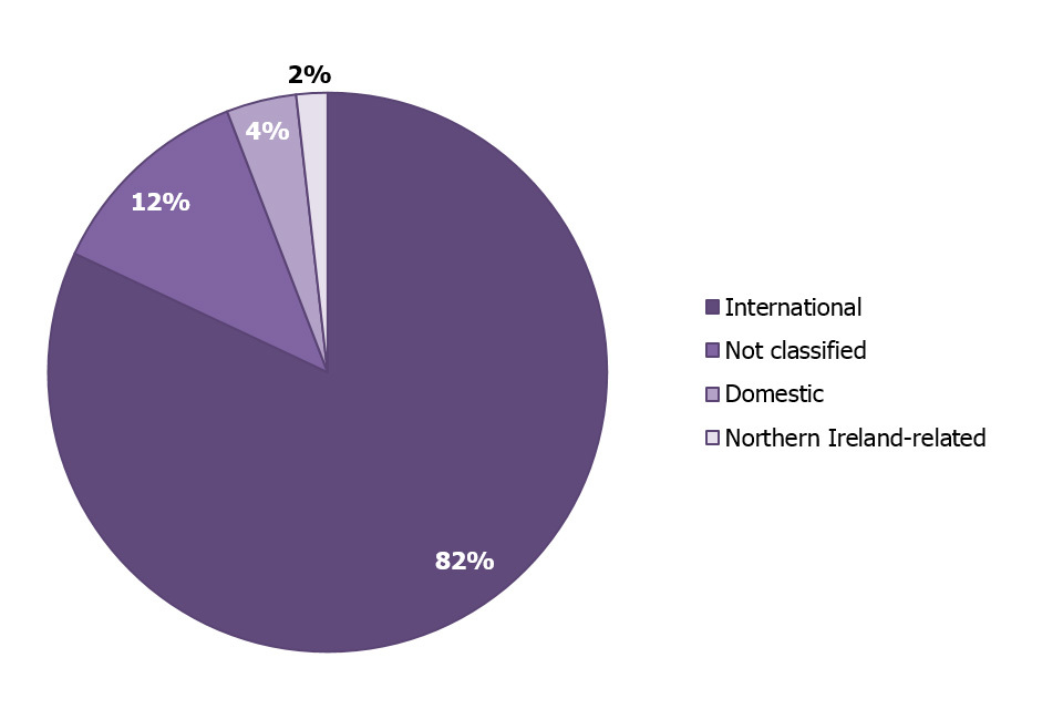 When an individual is arrested, they are categorised according to the type of terrorism they are involved in. They may be categorised as either ‘international’, ‘domestic’, ‘Northern Ireland-related’ or ‘not classified’. Definitions for each of these categories can be found in the user guide.