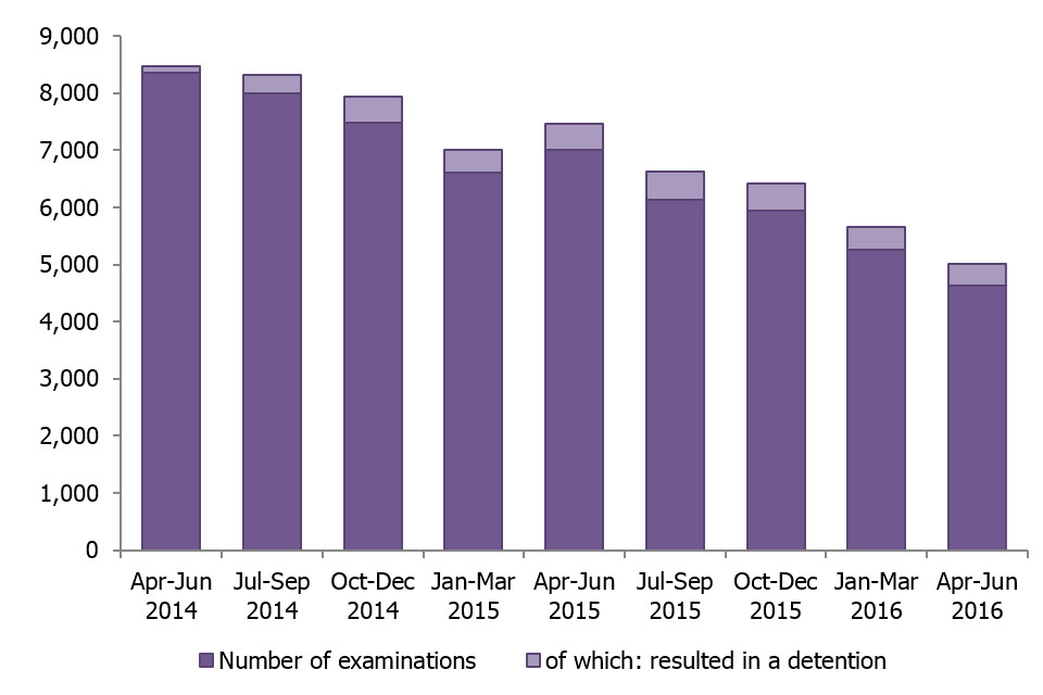 In the year ending June 2016, a total of 23,717 persons were examined under this power in Great Britain, a fall of 23% on the previous year. This has resulted from a gradual decline in the use of the power each quarter over the last couple of years.