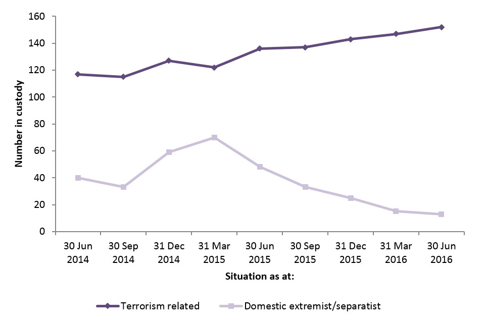 As at 30 June 2016, there were 165 persons in custody in Great Britain for both terrorism-related (152) and domestic extremism/separatism (13) offences.