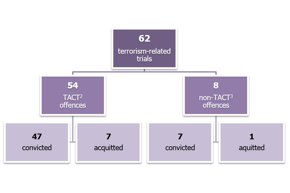 In the year ending June 2016, there were 62 trials completed by the CPS CTD for terrorism-related offences. This was 12 more than the 50 trials completed in the previous year and was in part driven by a high number of trials between October and December 2015 and April to June 2016. Of the 62 persons proceeded against, 54 (87%) were convicted; the defendant was acquitted in the remaining 8 cases.
