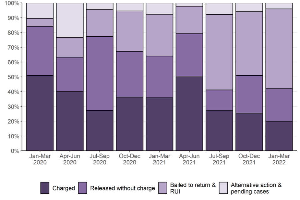 - ‘Bailed to return’ includes those released on bail pending further investigations, and those who have absconded from bail. Those who were released under investigation were previously unable to be recorded separately and were recorded as ‘released without charge’.