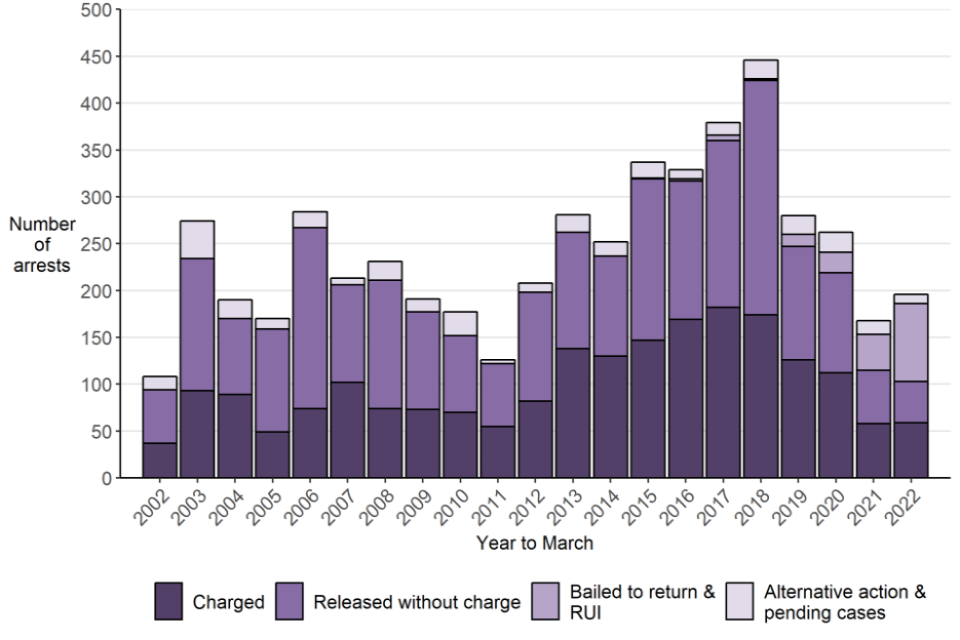 There were reductions in the number of arrests starting from April to June 2020. The reductions were most evident in arrests under non-terrorism legislation and may reflect the general reduction in traditional crime during this period when there were public health restrictions in place to control the spread of the COVID-19 virus. This effect was most marked in April to June 2020 during the national lockdowns in England and Wales with just 31 arrests in this quarter. Following the easing of restrictions over the summer months, the number of arrests increased (for example, up to 55 arrests between October to December 2020). During the third national lockdown the number of arrests fell again, between January to March 2021, down to 39. In the latest two quarters, between October and December 2021, and January and March 2022, the number of arrests increased, to 51 and 50, respectively.