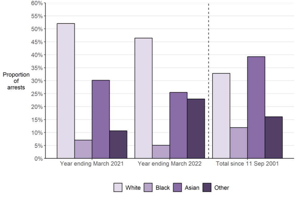 Operation of police powers under the Terrorism Act 2000 and subsequent legislation: Arrests, outcomes, and stop and search, Great Britain, quarterly update to March 2022