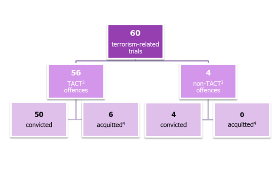 Further details of the specific legislation under which persons have been convicted following a charge for a terrorism-related offence can be found in data tables A - A.08a-c.