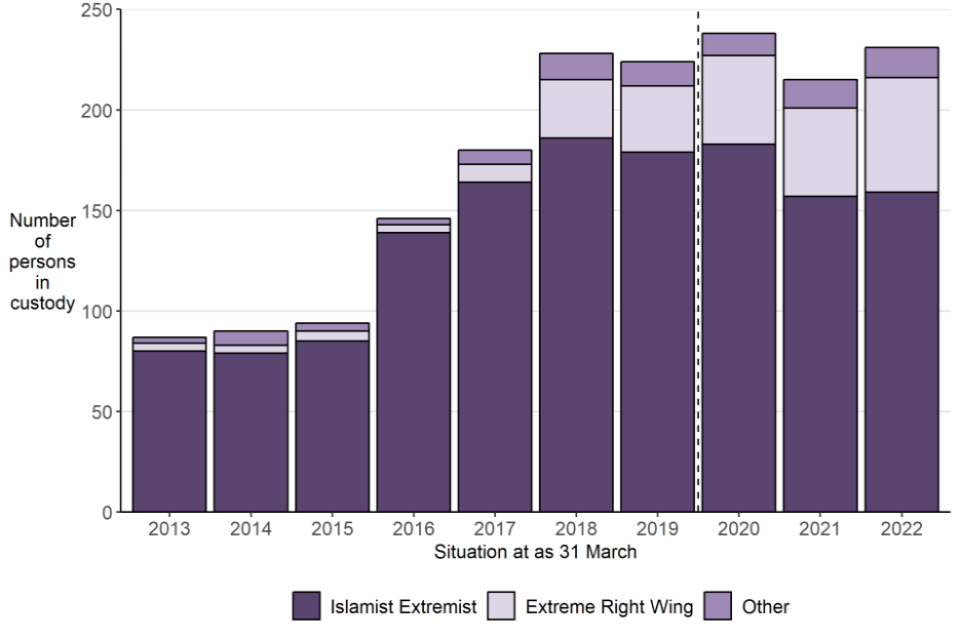 Of those in custody, 159 (68%) were categorised as holding Islamist-extremist views, two more compared to the previous year. A further 57 (24%) were categorised as holding Extreme Right-Wing ideologies, up by 30% and a three percentage point increase compared to the previous year. The remaining 17 prisoners (7%) were categorised as holding beliefs related to other ideologies, the same as the previous year.